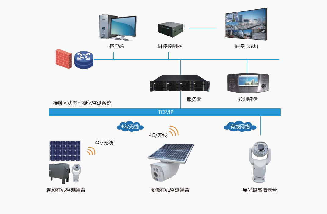鐵路供電的特點(diǎn)是線路長(zhǎng),地點(diǎn)偏僻,環(huán)境復(fù)雜,單純依靠人工巡檢效果差,安全風(fēng)險(xiǎn)大,隱患重重,供電安全直接影響著鐵路運(yùn)輸?shù)恼V刃?。接觸網(wǎng)狀態(tài)可視化監(jiān)控系統(tǒng)是一套全方位監(jiān)管電氣化鐵路牽引供電線路的遠(yuǎn)程巡檢系統(tǒng),該系統(tǒng)根據(jù)高速鐵路供電設(shè)備運(yùn)行的安全需求,可對(duì)上跨橋、上跨電力線、隧道出入口、大風(fēng)區(qū)等重點(diǎn)位置進(jìn)行圖像/視頻監(jiān)測(cè),對(duì)故障事件起到“早發(fā)現(xiàn)、早預(yù)防”的作用,保障高速鐵路運(yùn)營(yíng)秩序,保障電氣化鐵路接觸網(wǎng)高效、安全、可靠的運(yùn)行