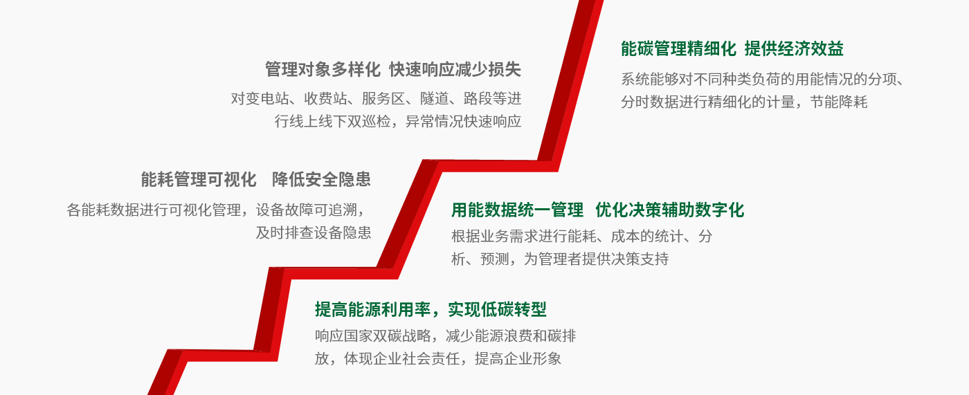 高速公路隧道、收費(fèi)站、服務(wù)區(qū)的日常運(yùn)營能耗的監(jiān)測管理既是實(shí)現(xiàn)“碳達(dá)峰、碳中和”的重點(diǎn)工作,也是企業(yè)實(shí)現(xiàn)綠色低碳發(fā)展的迫切需要,同時(shí)通過能耗在線監(jiān)測,可有效發(fā)現(xiàn)“滴冒跑漏”,節(jié)能降耗,有利于企業(yè)降本增效。